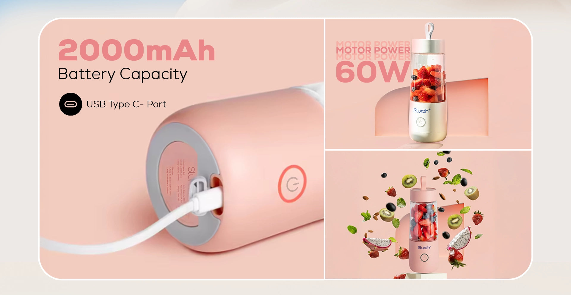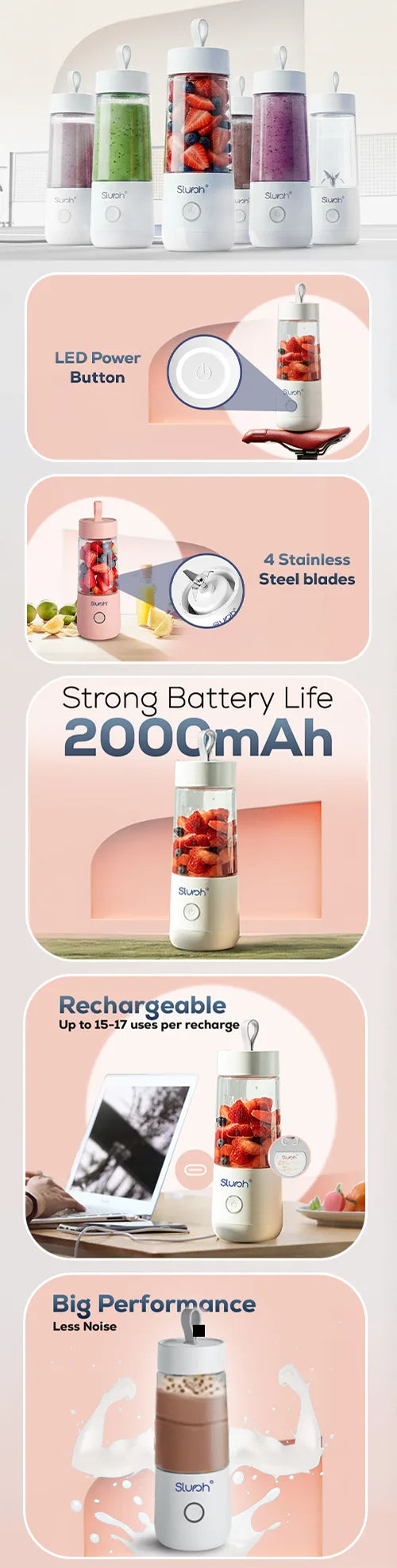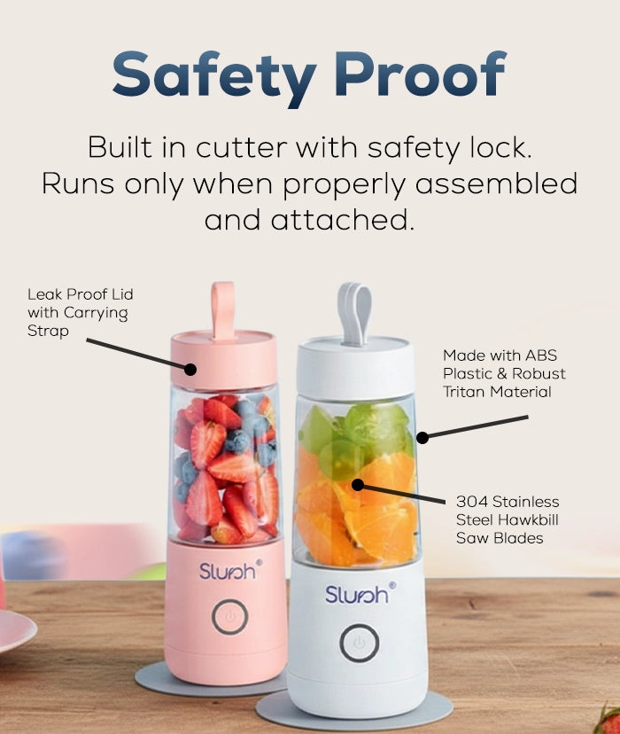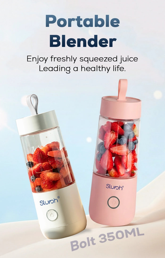 Once Slursh Bolt -350 ML Blender is fully charged, it is ready to make your favorite smoothies, juices and much more. You need to press and hold the power button, the White LED will blink 3 times and slurshing will begin. To stop, you need to press and release the power button again to stop.