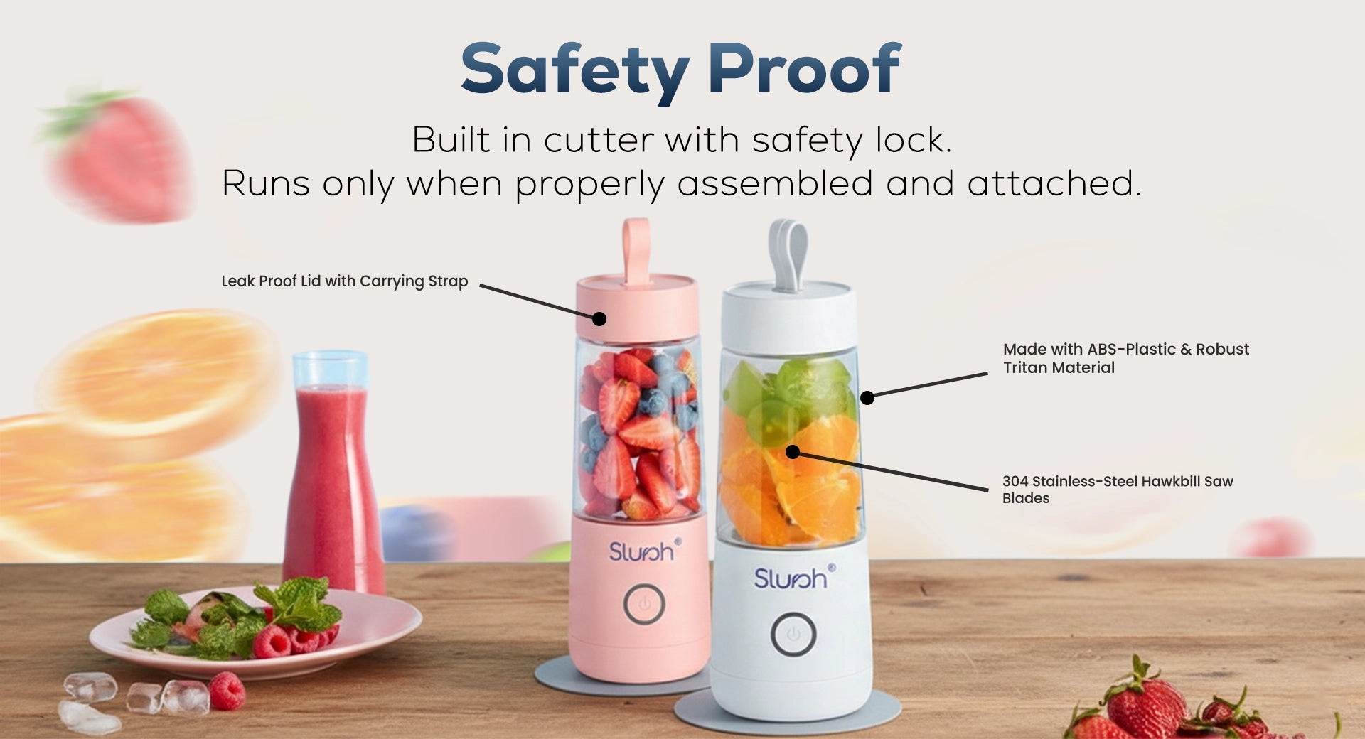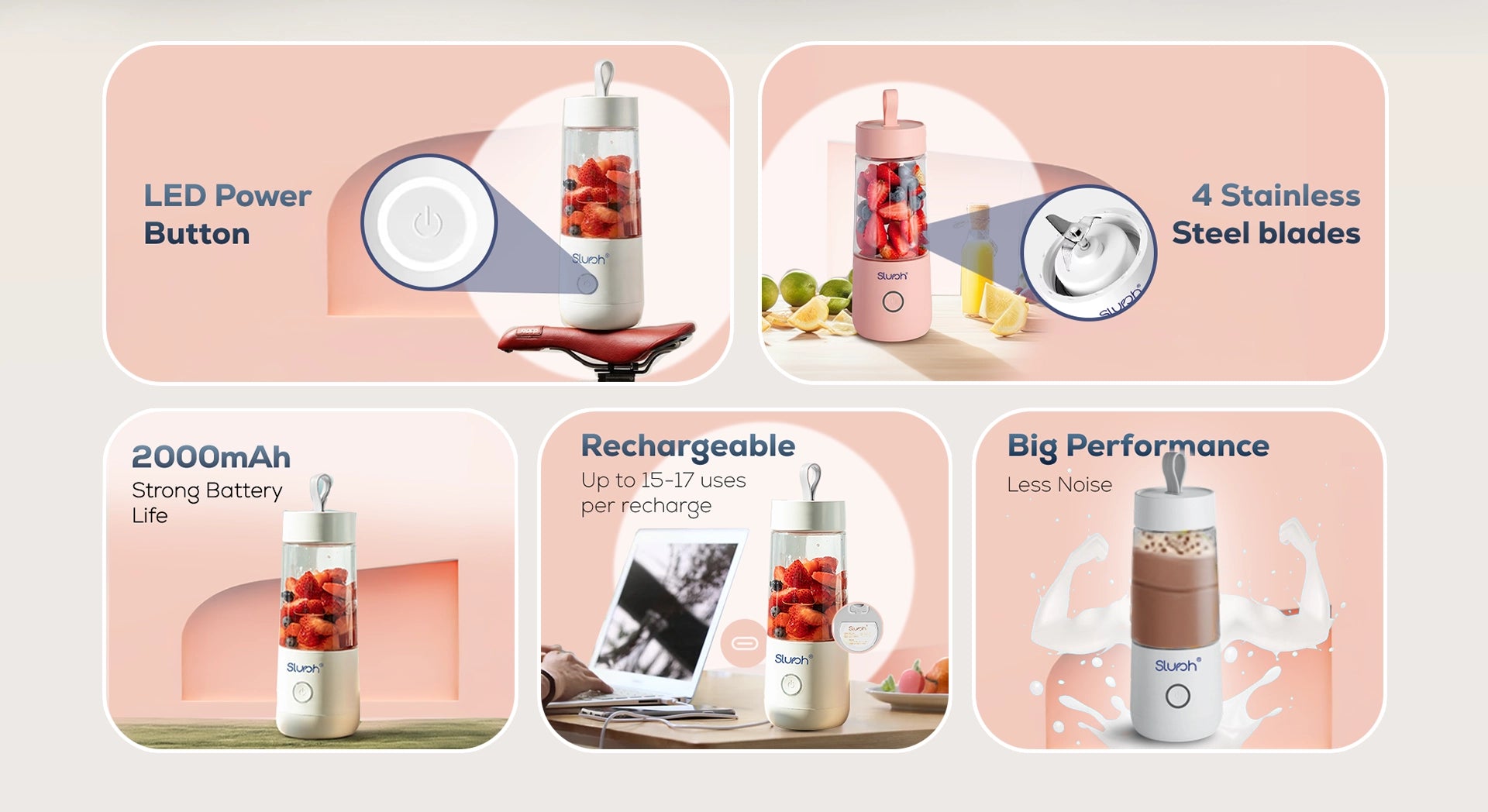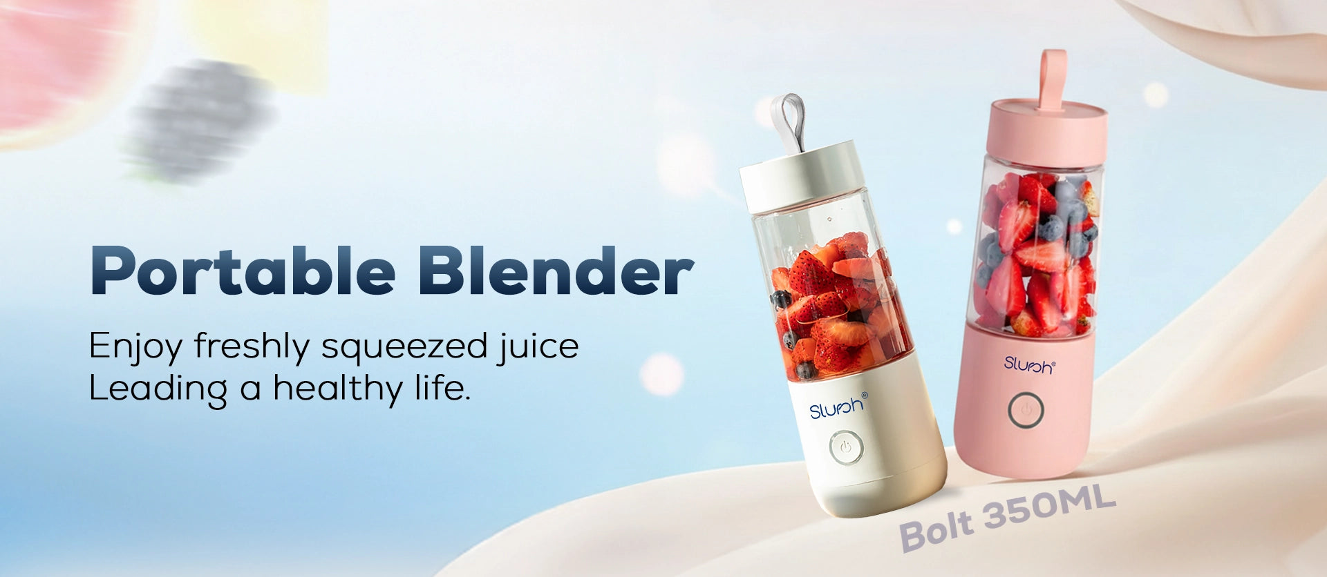 Once Slursh Bolt -350 ML Blender is fully charged, it is ready to make your favorite smoothies, juices and much more. You need to press and hold the power button, the White LED will blink 3 times and slurshing will begin. To stop, you need to press and release the power button again to stop.